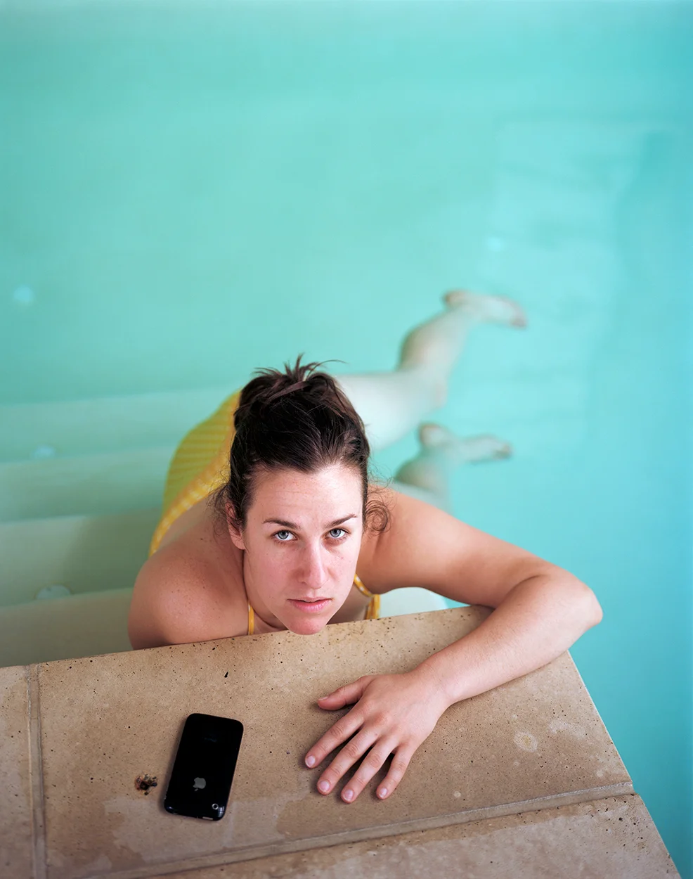 Mobile comments on the impact of mobile technology and social media in today’s society. In these images, I recreate the relatively new phenomenon of people interacting with their mobile devices in public and private spaces, calling attention to the mental block and emotional disconnect that result from information-dependency. This headspace removes subjects from their immediate surroundings, often showing them entranced and absorbed by their mobile devices, and disconnected from others. This project explores the widespread change in socialization within both the public and private spheres, questioning how our use of technology alters our day-to-day experiences, heightening anxiety levels and removing us from our general awareness beyond our handheld devices. I capture my closest friends and family members in these moments, pulling their focus away from the device that monopolizes their attention in an attempt to regain a personal connection. I make these portraits with a 4x5 view camera, standing above the camera so that I am able to maintain eye contact with my subjects, engaging them in an unobscured manner. Yet, because I am also using a device to create the image, one could question if the subject’s awareness of their picture being taken is what awakens them from their isolated state.